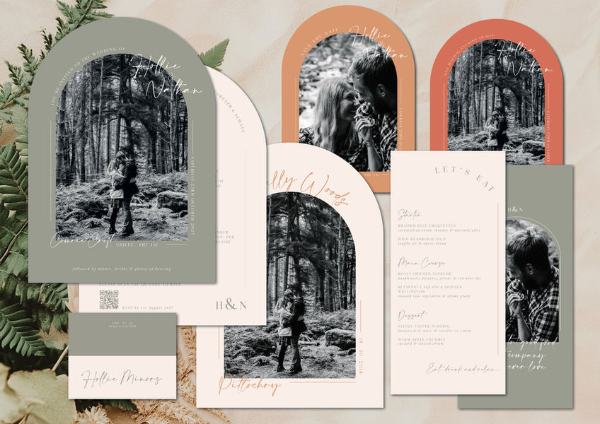 Our 'Forever' Collection brings together rustic charm and timeless elegance with a clean, minimal design. Delicate script fonts and softly curved cardstock edges create a graceful, romantic feel, while the option to include your own photos adds a truly personal touch.